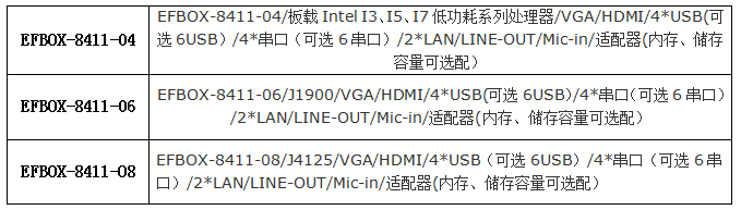 EBOX-8411是一款无风扇低功耗高效能嵌入式整机,采用Intel J1900/J4125/酷睿I3/5/7系列多平台低功耗处理器,结构紧凑、坚固、无风扇设计,外壳兼作散热用,具有优良的密封防尘、散热与抗振性能;广泛应用于多媒体广告机,机场航显,智能交通视频监控等各种媒体视频领域。